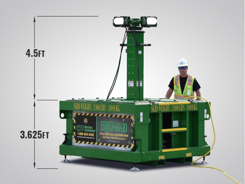 Portable Explosion Proof Light Tower built with Spark-Free Aluminum Construction featuring 4 BRICK® Explosion Proof Lights It is a requirement to use CERTIFIED Explosion Proof lighting within a zone declared a hazardous location. Refinery customers have begun to realize using BRICKs for area lighting just outside hazardous location (HAZLOC) areas are not only cost effective but meet this primary objective. The BRICKSkid™ can be used in place of the standard generator-driven light towers. Especially when working around HAZLOC areas such as active well heads or drill sites. This explosion proof light tower will also remove any concerns of having a gas-driven engine operating near the entrance of a confined space area. Also eliminate environmental issues like fueling, drip pans, maintenance, noise, emissions, etc.